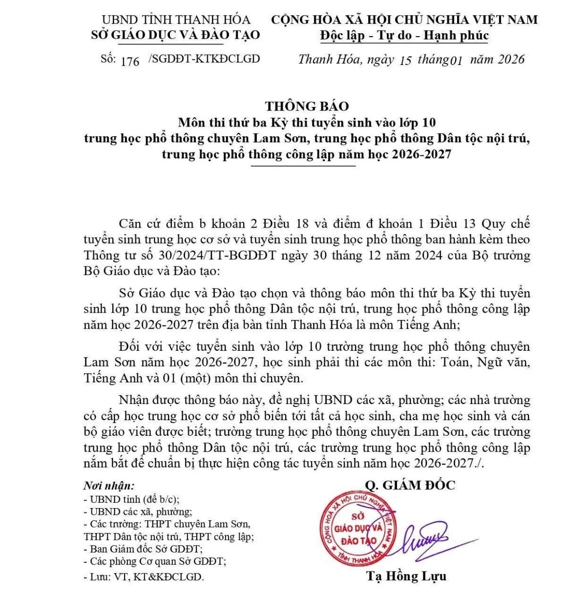 Sở GD&ĐT đề nghị các xã, phường, nhà trường có cấp học THCS phổ biến tới tất cả học sinh, cha mẹ học sinh và cán bộ giáo viên được biết về môn thi thứ ba; Trường THPT Chuyên Lam Sơn, các trường THPT Dân tộc nội trú, các trường THPT công lập chuẩn bị các điều kiện thực hiện công tác tuyển sinh năm học 2026-2027 theo yêu cầu.