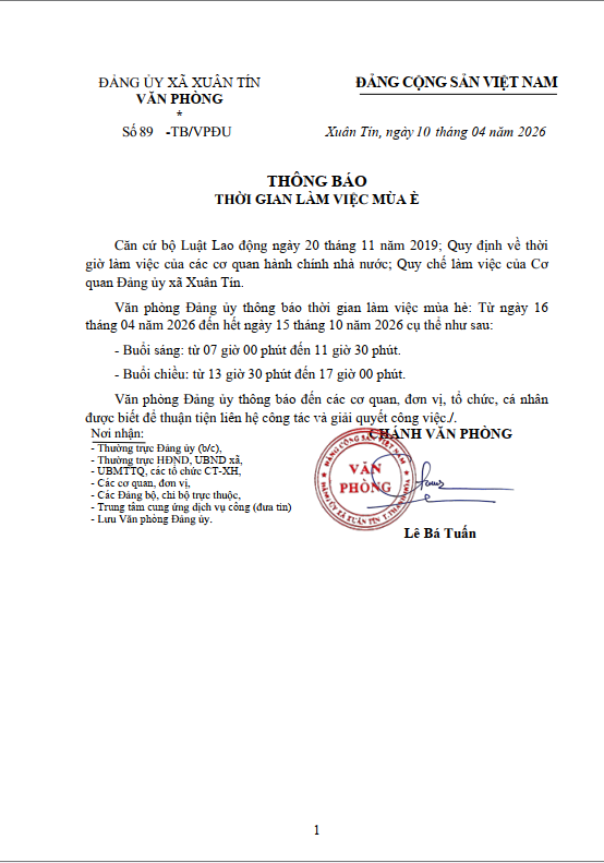 Căn cứ Bộ Luật Lao động năm 2019 và quy chế làm việc của cơ quan Đảng ủy xã Xuân Tín, Văn phòng Đảng ủy thông báo thời gian làm việc mùa hè năm 2026 như sau: